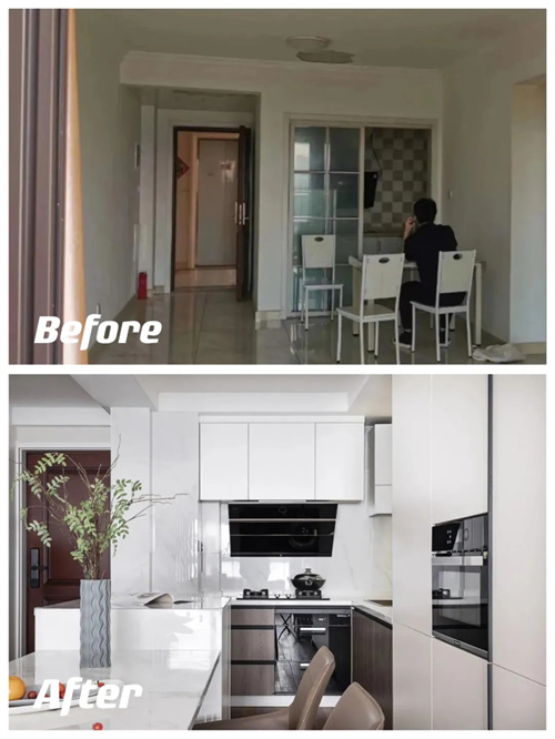 原厨房不仅封边,而且空间小,虽然给餐厅腾出了位置,但这样的厨房用起来实在是太憋屈。