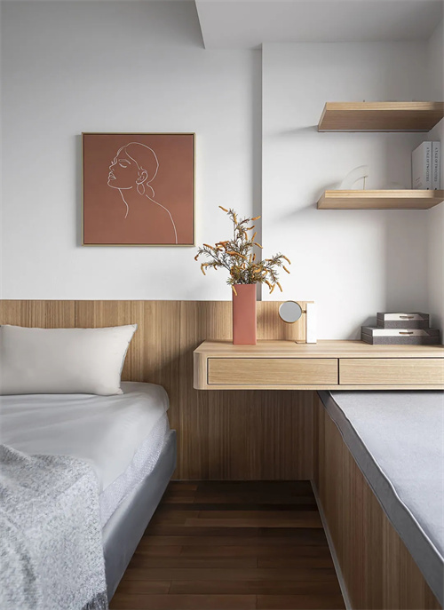 卧室和客厅一样采用了无主灯设计,同时对中央空调的出口做了隐藏化处理。对于吊顶的积灰问题,设计师选择用硅藻泥来解决,这样更不容易积灰。