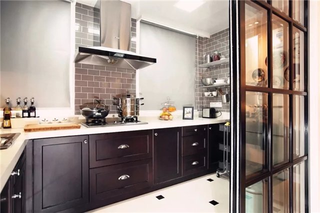 黑色框架的推拉门后,以黑色橱柜搭配白色操作台,墙面部分以灰色墙砖粘贴,让烹饪空间显得独特而雅致。