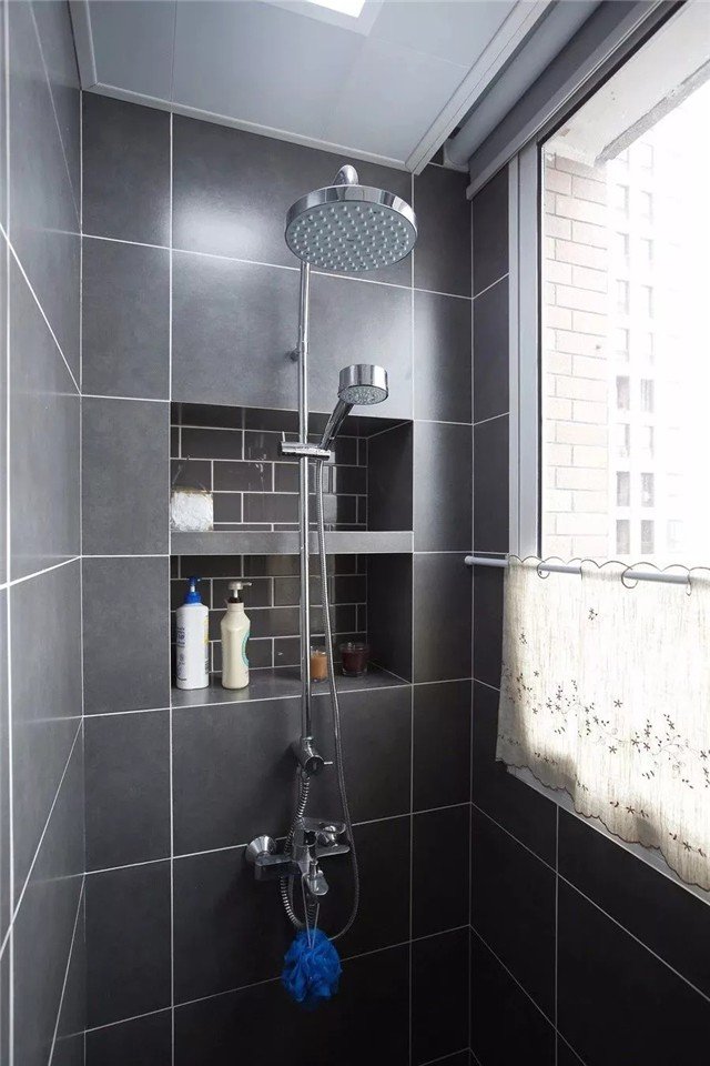 淋浴区以深灰色的空间,淋浴花洒前方的墙面还挖了2个壁龛,摆上淋浴用品,非常的方便。